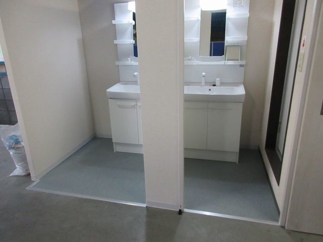 手洗いや清掃時に1台の手洗い器では不便でしたようで、女性用トイレ室前にもドアを付けてプライバー保護にも役立つ工事となりました
