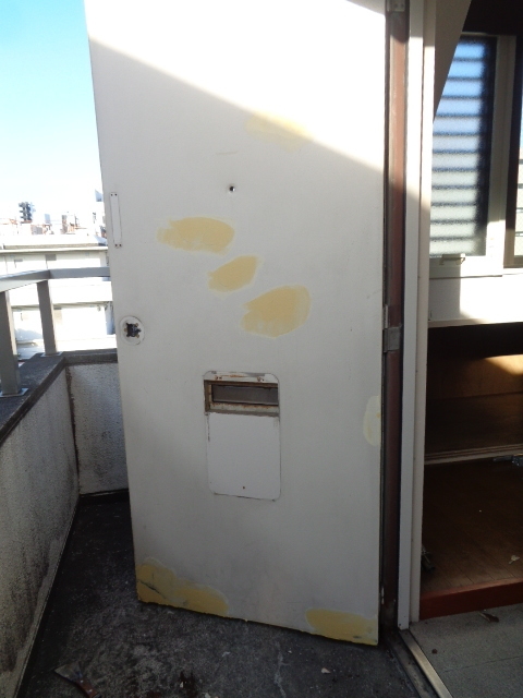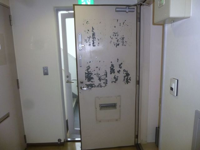 塗装が剥がれて汚れた鉄扉
