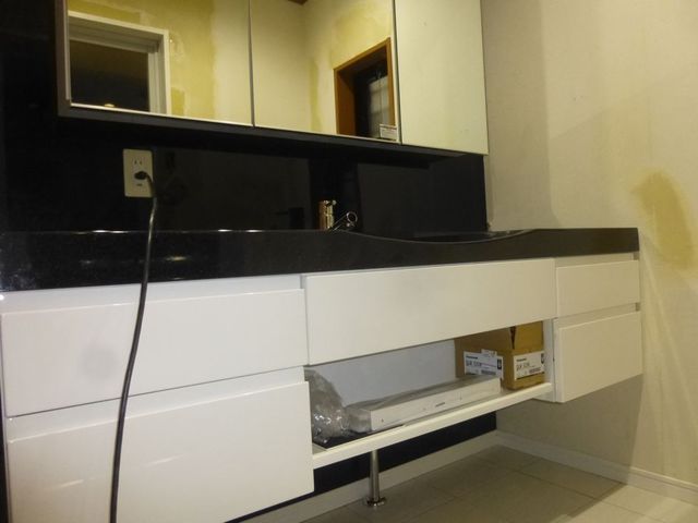 ドレッサー側には水跳ねなども考えて、パナソニック製の大理石調のブラックで仕上げています。