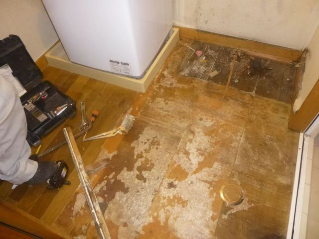 既存の洗面化粧台から漏水していまして、床などが腐っている状態でした。少量の漏水の場合は気が付かない場合があります。お客さまも一カ月間原因が分からずにいました