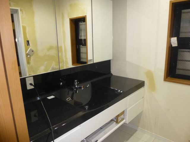 腐ってしまったフローリングは解体して、新しいベニヤを貼り化粧台も交換する事になりました