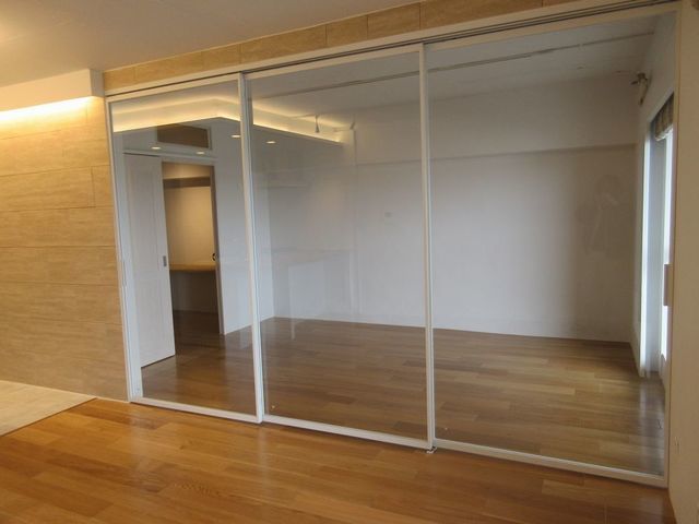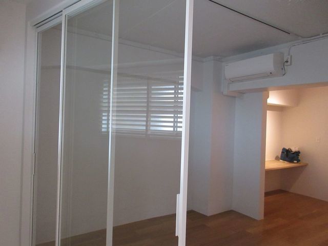 サンワカンパニー製の3枚連動式のガラス戸で室内空間を有効利用してあります
