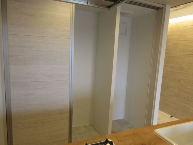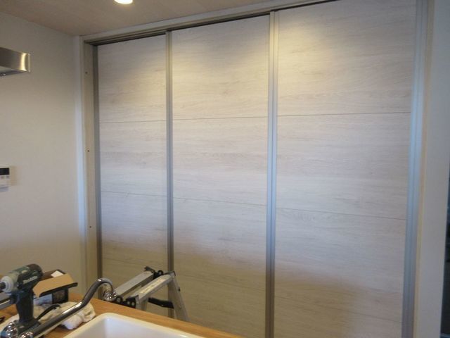 キッチン背面に3箇所の大きな収納、冷蔵庫置場 洗濯室 食器置場 よく使うスペースを作りました。見栄えもいいようにパナソニック製の3枚引戸で簡単に隠すこともでき、カビが発生しにくいように換気扇も取付けてあります